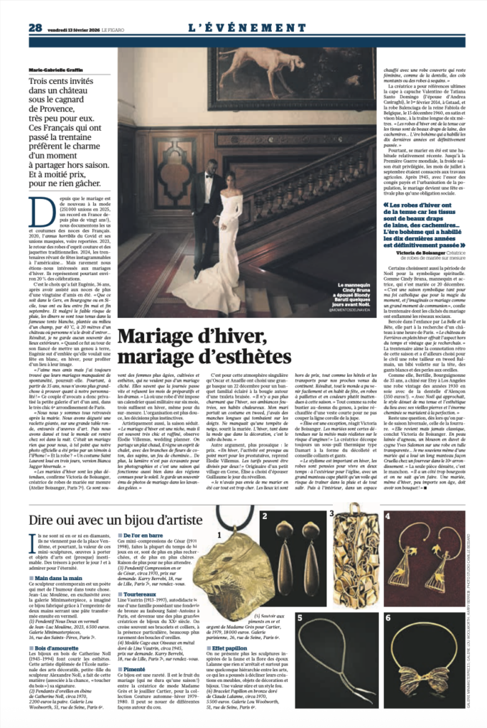 We are delighted to share a recent feature in Le Figaro, “Mariage d’hiver, mariage d’esthètes” by Marie-Gabrielle Graffin, highlighting the renewed allure of artist-designed jewels for winter weddings.
