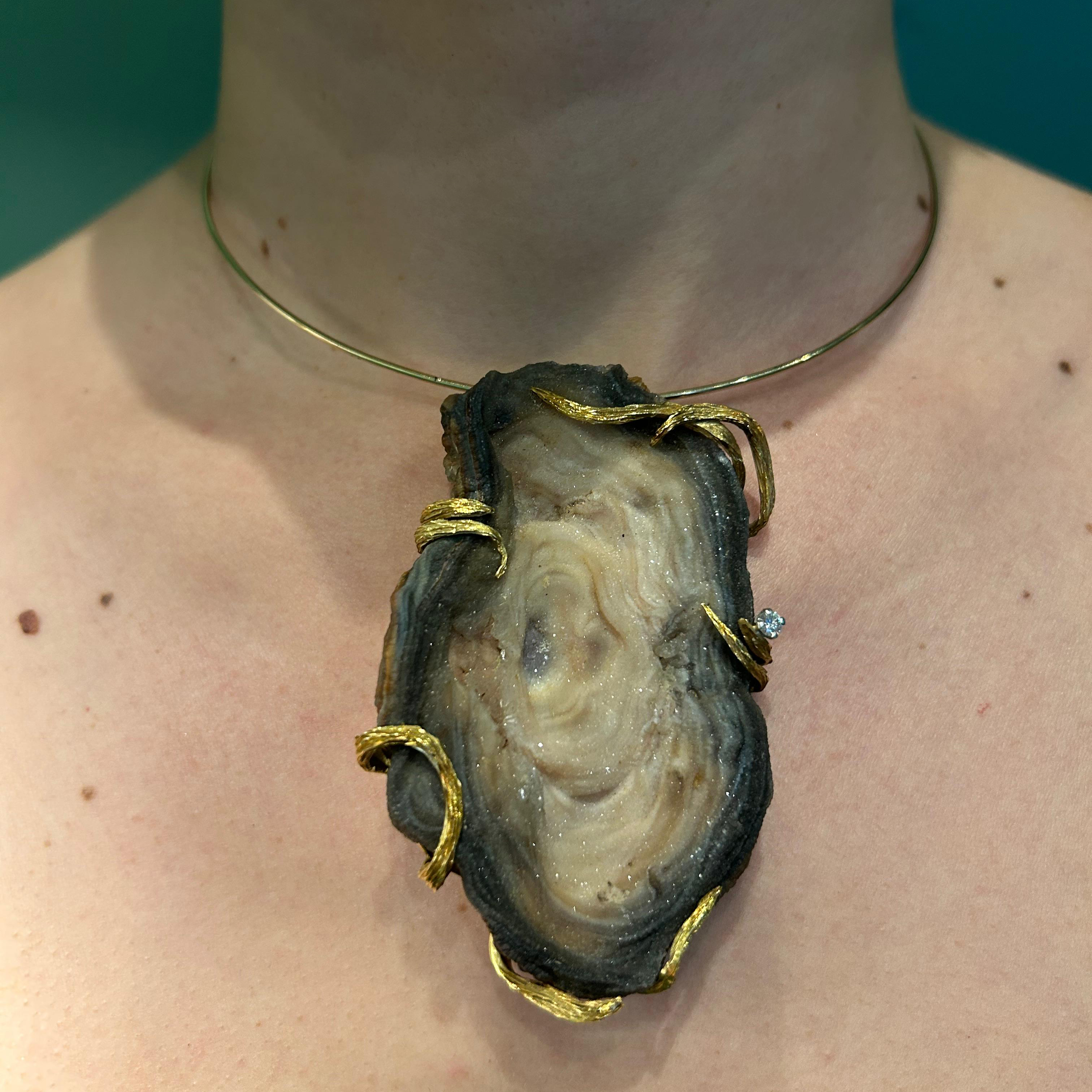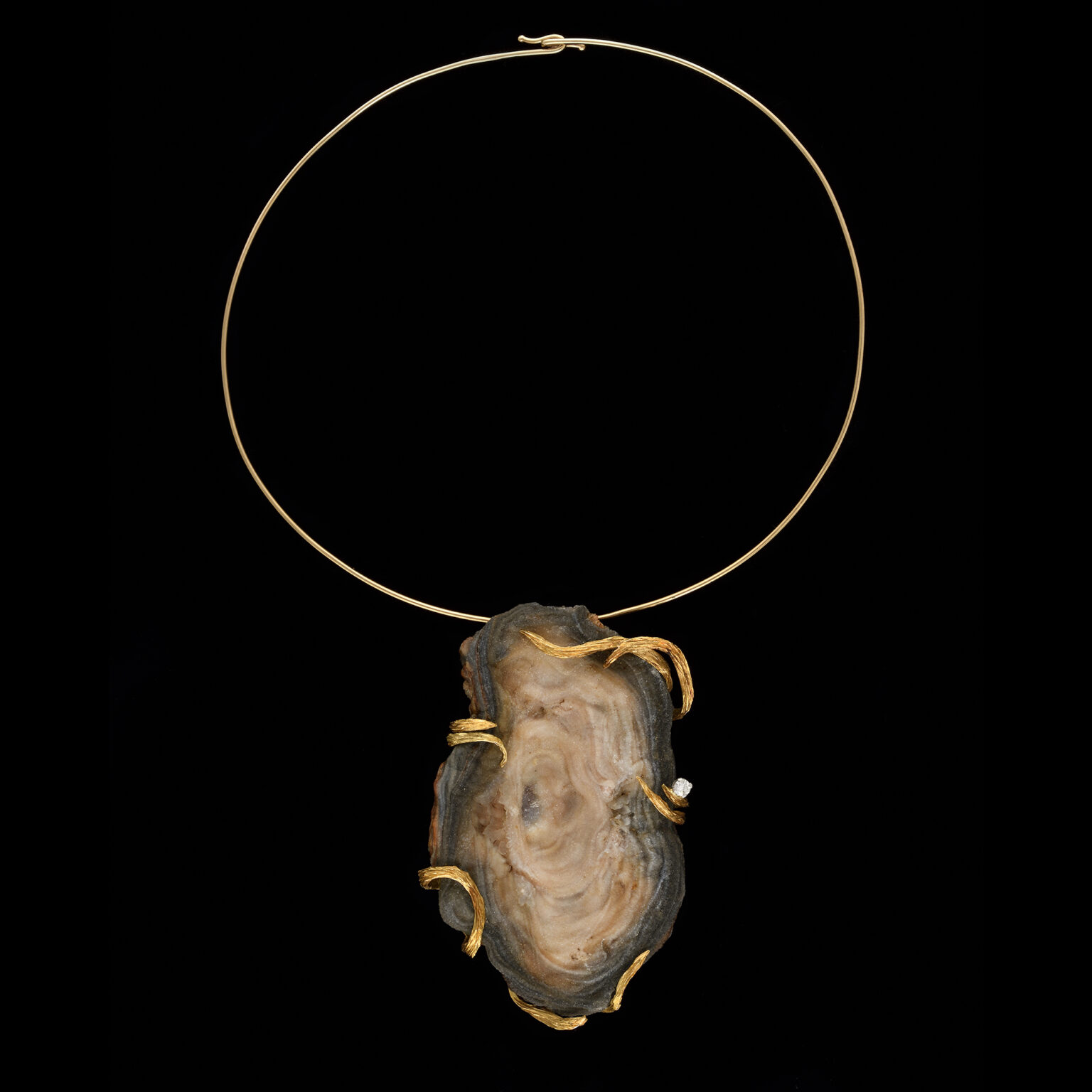 18k yellow gold, set with 1 natural agate in an organically designed gold mount, accented by 1 small brilliant-cut diamond