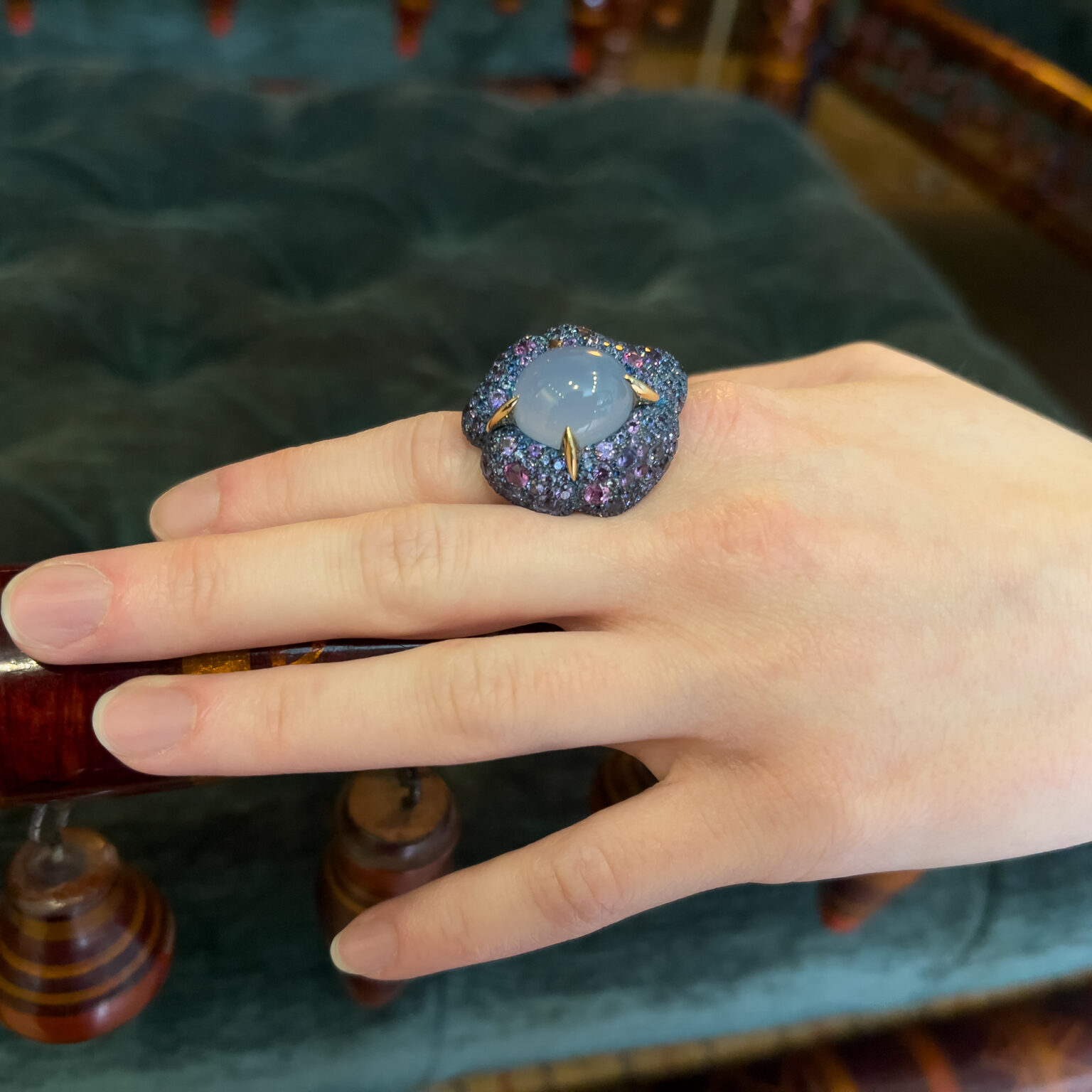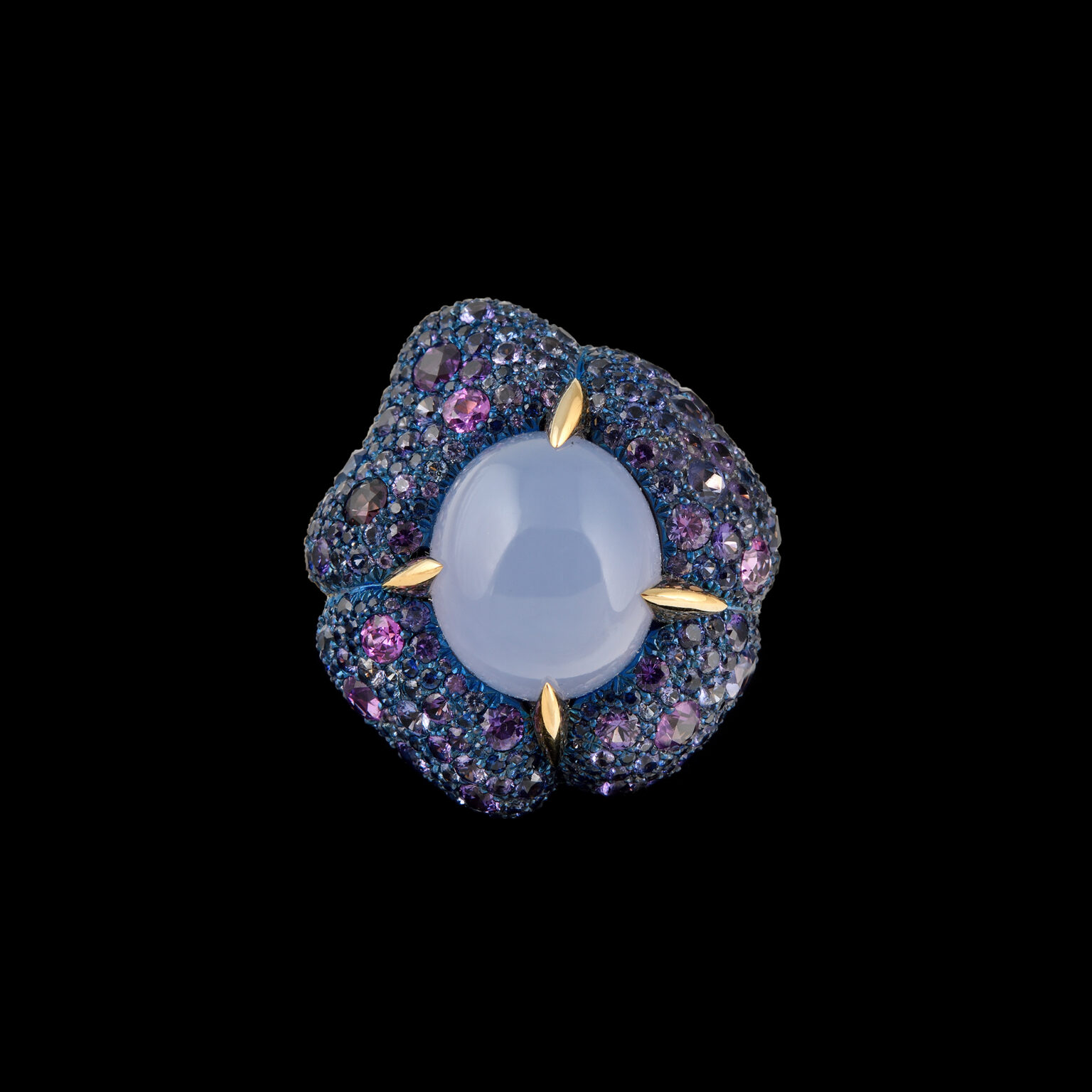 Calcedony 14,15 ct, Sapphires 6,61 ct,  Diamonds 0,12 ct and 18k Gold
